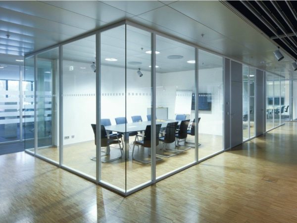 Противопожарные перегородки с одинарным стеклом могут изготавливаться как в полностью остекленном варианте, так и в частично остекленном исполнении. Основное предназначение таких конструкций — это разделение общего помещения на несколько отдельных рабочих зон. При этом преследуется несколько целей: